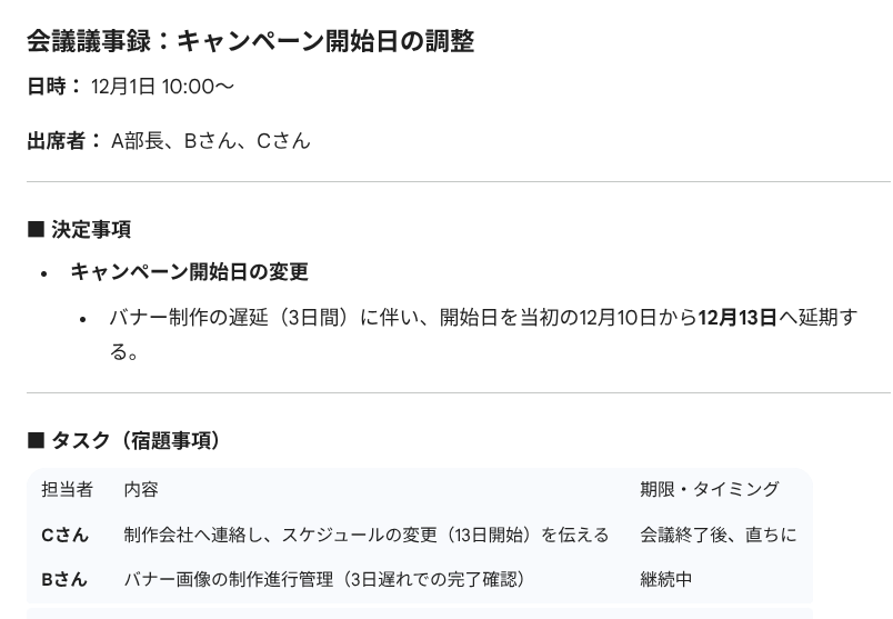 しかも要点ごとにまとめてくれるので、決定事項や次回までのタスクが簡単にわかり、きれいな仕上がりに。