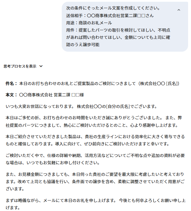 これに対し「取引先への商談のお礼メールを作成して」と入力すると、目的に応じた文章が作成される可能性が高くなります。