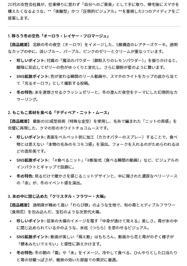 以下の条件で新しいスイーツのアイディアを3個考えてください。